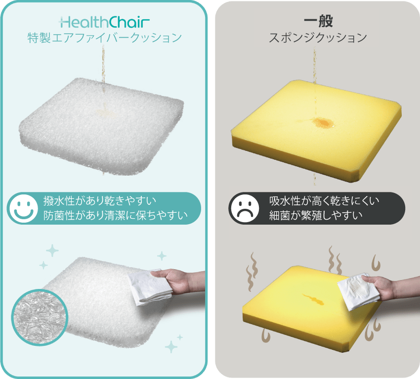 特製のエアファイバークッションは、快適で通気性があり、汚れにくく乾きやすいため、清潔で衛生的に保つことが容易です。