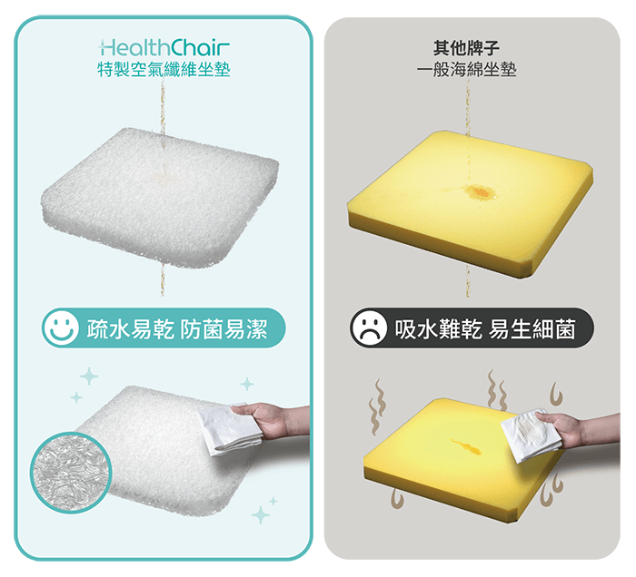 特製空氣纖維坐墊,舒適透氣,比起一般海綿坐墊防污易乾,易於保持清潔衛生,耐用度高而不易變形。